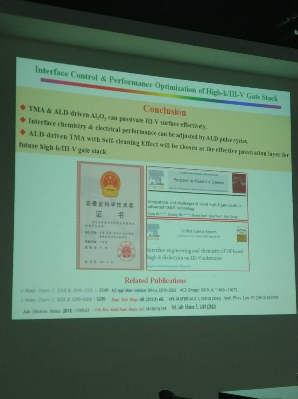 会议伊始,主持人为在座师生介绍了何刚教授的学习与工作经历,大家报以热烈掌声欢迎何教授的到来。何刚教授任安徽大学物理与材料科学公司教授。主要从事新型高k栅介质的设计、制备及与器件集成相关的科研工作。主要的研究内容:新型高k栅的掺杂设计及结构优化、高k栅的界面钝化、以及高k栅在场效应器件与薄膜晶体管方面的应用等。何刚教授多次应邀在国际学术会议上作邀请报告,并多次组织学术会议。迄今为止,已在Pro. Mater. Sci, Sur. Sci. Rep, Adv. Electro Mater, Appl. Phys. Lett, Phy. Rev. B, Phys. Rev. Appl.等国际学术期刊上发表SCI论文200余篇。发表论文总被Nature Mater., J. Am. Chem. Soc., Adv. Funct. Mater.等国际学术期刊论文引用3100余次,H因子27;主持国家自然科学基金、教育部重点项目、安徽省自然基金等项目。安徽省自然科学二等奖获得者(排名第一)。然后,何刚教授开始详细的向各位师生做报告。首先给大家介绍了高k栅介质的研究背景及他们在硅基高k栅材料选择及界面修饰方面的研究工作。另一方面,针对高k栅介质本身的缺陷及硅基的服役周期物理问题,介绍他们在高迁移沟道材料与高k栅异质集成方面的研究工作。最后,结合新型高k栅的优势,介绍他们目前在薄膜晶体管方面取得的部分研究进展。