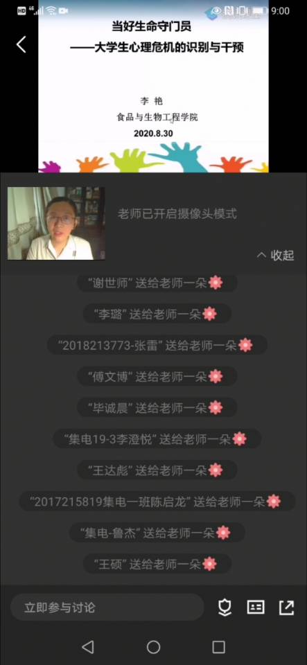 李艳老师首先从学会共情、学会识别、学会干预三个角度出发,以目前老员工中存在的典型心理问题进行案例分析,阐述了如何区分正常与异常心理、老员工常见的心理问题及其表现,指导了员工干部、心理联络员应如何辅助老师进行信息收集和心理异常的评估工作,找出潜在的重点关注对象。接着,李艳老师让同学们在线做了自杀预防常识问卷,并以此为切入点,结合真实案例,分析了自杀倾向的征兆、触发因素,介绍了危机处理的正确流程。最后,李老师介绍了合肥市危机干预热线、集团心理健康教育与咨询中心的咨询预约电话和网址,并推荐了一系列心理健康微信公众号,呼吁各位同学发挥心理健康知识传播使者的作用,及时反馈班级心理状态,为同学们的健康成长保驾护航。