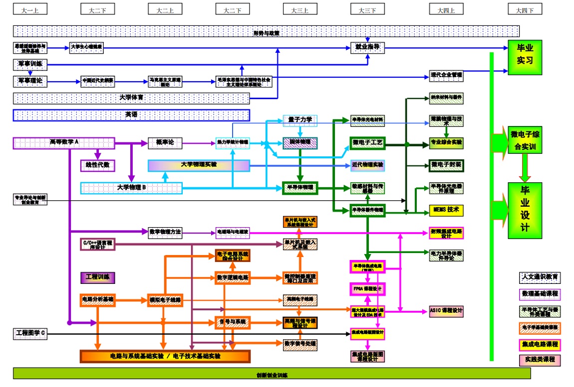 主干课程:电路分析基础、模拟电子技术基础、信号与系统、数字逻辑电路、微控制器原理接口与应用、固体物理、半导体物理、半导体器件物理、微电子工艺、半导体集成电路、超大规模集成电路设计及EDA技术