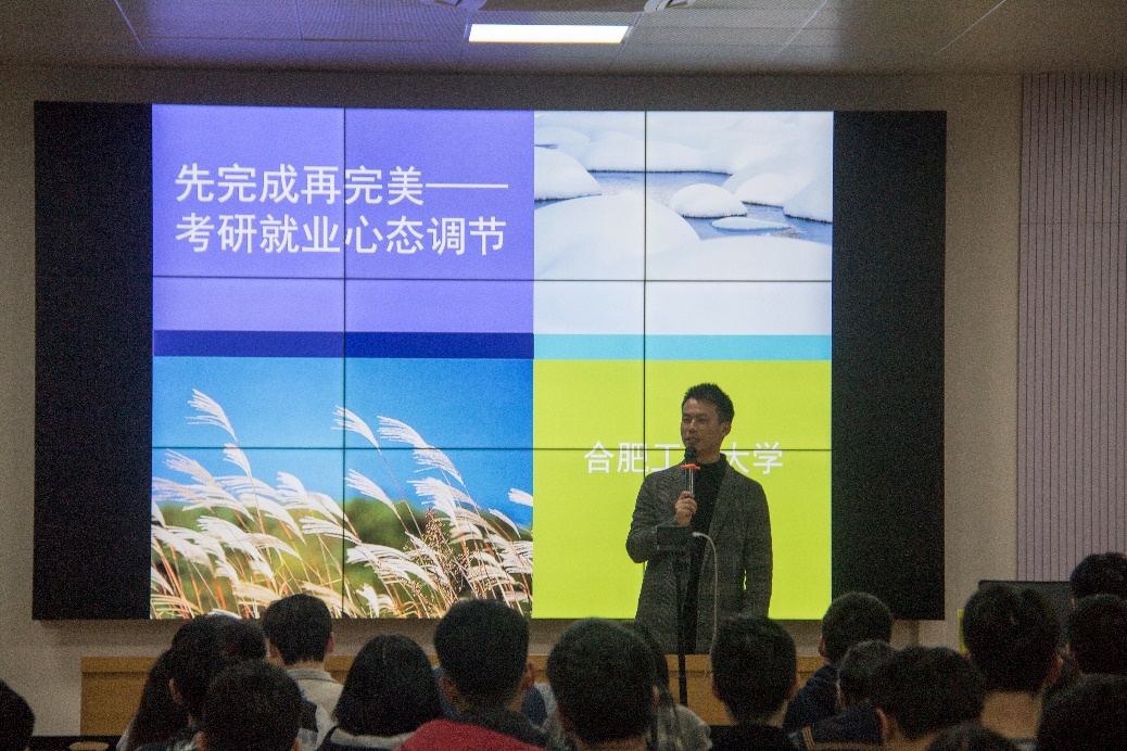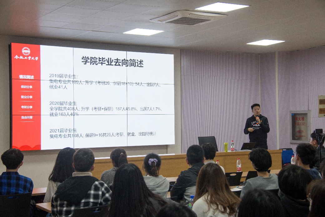 学工部第三党小组成员、心理健康教育与咨询中心咨询师骆贵为同学们介绍了压力调试小技巧。骆贵通过游戏、理论、案例层层推进,引导同学们正确认识自我,选择合适的方向,调节压力水平。随后,公司2017级推免生陈书兰、刘月月两位党员同学,从自身经历出发,围绕推免准备、推免过程等为同学们详细介绍了推免流程及需要注意的技巧;公司2017级党员翁晓峰向同学们详细梳理了专业就业方向和行业现状,就知识储备、应聘流程提出建议;公司2019级硕士研究生党员庞高远分享了自己的研究生生活和就业经历,重点分析了考研与就业的利与弊,为同学们提供了参考;公司2017级周攀、李海禄两位党员同学为大家分享了考研的准备过程与注意事项,并针对如何积累自身优势提出了有效建议。