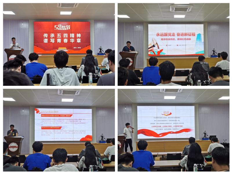 本次专题党课以朋辈教育的形式开展。姜宇杰等4名高年级党员同学围绕“弘扬五四精神,培育时代新人”“以奋斗唱响五四赞歌”“永远跟党走,奋进新征程”“传承五四精神,谱写青春华章”等主题展开讲述。