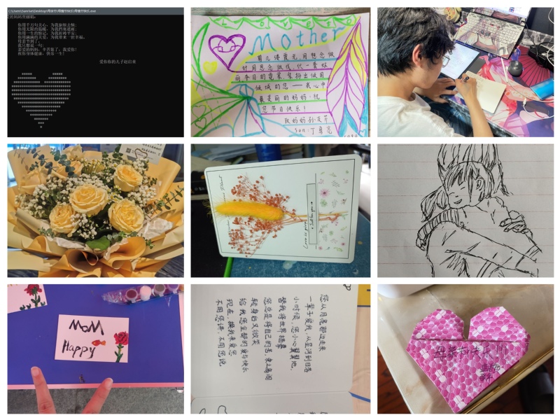 本次活动包含“献一份爱心”、“送一份开心”、“给一个安心”三个模块。在“献一份爱心”模块,同学们开动脑筋,花式制作爱心图案。如有的同学利用专业技能,用代码敲出独特的爱心;有的同学用颜料绘出五彩斑斓的爱心;有的同学灵巧的手工制作出爱心。一个个的爱心都蕴含着同学们对母亲浓浓的爱。在“送一份开心”环节,同学们纷纷通过“三行情书”“一封家书”等形式积极大胆地写下自己平日中对妈妈羞于表达的词句,有的蕴含一份思念,有的散发一丝伤感,有的则溢出了满满的愧疚。在“给一个放心”环节,活动鼓励同学们写下学期的学业规划、职业规划,通过晚间微信、电话等方式与与妈妈交流,让妈妈安心放心。