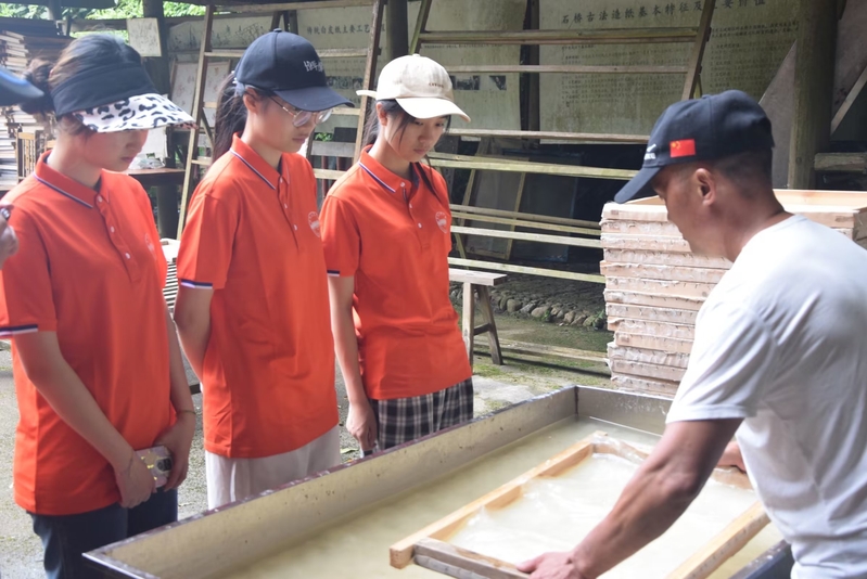 走进石桥古村落,感知生活新变化。为探索农村发展新道路,团队走进石桥村,感知当地发展现状。通过调查问卷等形式采访村民,听他们讲述造纸产业的发展给他们生活对来的变化。通过交谈,了解到当地依托非遗文化搭上旅游业的快车道,文旅结合,将石桥造纸打出知名度。现在,石桥村纸产品的年产值达1500多万元,全村有60余户从事手工造纸工作,村民们依靠石桥古纸,实现足不出户增收,走出了独属于他们的乡村振兴的道路。于此同时,隐藏在蒸蒸日上的旅游业背后也存在一系列问题,如,旅游的相关设施还是很少;基础建设速度无法跟上发展速度;由于文物保护,村民无法重建更加明亮管阔明亮的现代房子等。凭借着非遗和旅游摆脱了贫困的石桥村其未来如何更好的发展,仍需更好的支持和更多的努力,路漫漫其修远兮,仍待上下而求索。