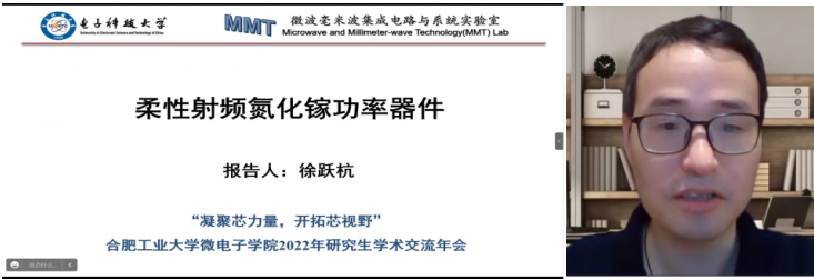 桑磊教授对主讲嘉宾和报告会议程进行了介绍。电子科技大学徐跃杭教授介绍了团队在柔性射频GaN器件制备、建模和电路设计方面的工作,他指出,通过铜基散热设计,有效提升了器件的散热特性,为柔性射频功率集成电路设计提供了一种新的思路,并探讨了柔性氮化镓射频器件在未来电子系统中的潜在应用。