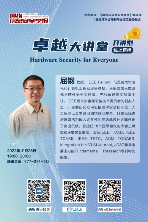 报告人简介:屈钢,教授,IEEE Fellow,马里兰大学电气和计算机工程系终身教授,马里兰嵌入式系统与硬件安全实验室、无线传感器实验室主任。IEEE硬件安全和可信技术委员会的创办人之一。主要研究方向包括硬件安全和可信、人工智能以及车联网和物联网安全,且在无线传感器网络和嵌入式系统的低功耗设计方面做出了突出贡献。曾担任18个国际会议的大会主席或程序委员会主席,现任IEEE TCAD,IEEE TCAS II,IEEE TETC, ACM TODAES, lntegration the VLSI Journal, JCST和基金委主办的Fundamental Research等刊物的编委。