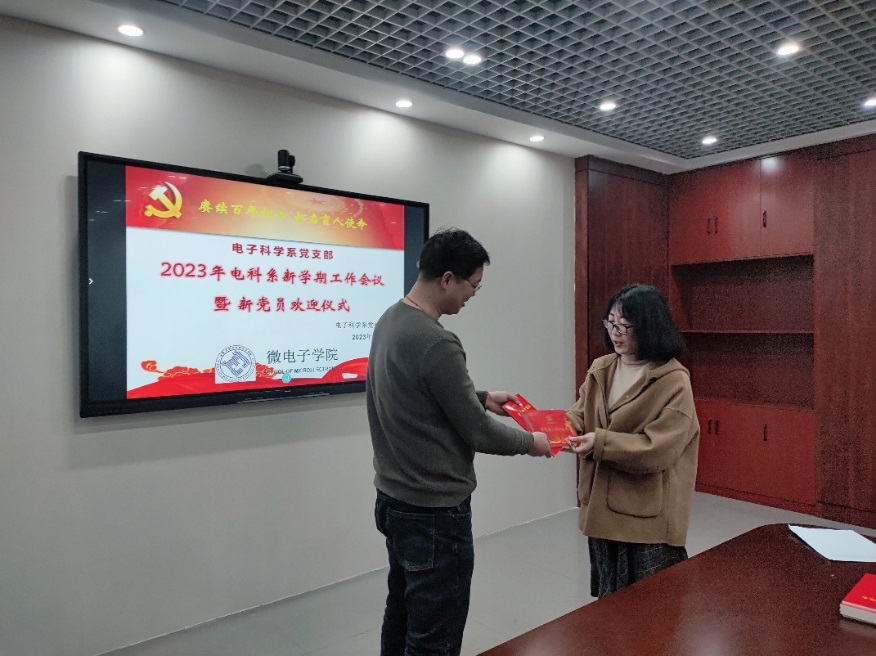 新党员刘波同志就自身情况向大家进行了介绍,并表达了今后要更加努力工作、为支部工作积极服务的愿望。支部党员对新党员表示欢迎和祝贺。张彦书记代表电科系党支部对刘波同志表示热烈的欢迎,并赠送了党徽、入党纪念卡及学习记录本。