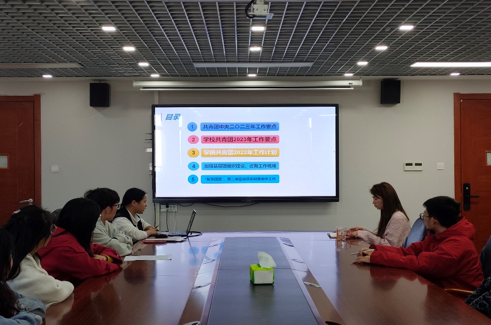 会上,公司学工办主任兼团委书记朱文拿带领全体团学干部集中学习共青团中央、公司共青团2023年工作要点,并要求各团支部书记会后要继续认真学习领会,把握工作方向、厘清工作思路、提出工作举措,在今年的基层团组织工作中去落细落实。随后,她为大家解读了公司共青团2023年的工作计划,并梳理近期重点工作,希望各支部要在思想引领、基层团组织规范化建设、团学组织深化改革、创新创业、社会实践、志愿服务、第二课堂成绩单制度落实等方面下功夫,通过“三会两制一课”“一月一团日”等平台做好共青团的各项工作,积极献言献策,服务青年,共同进步。