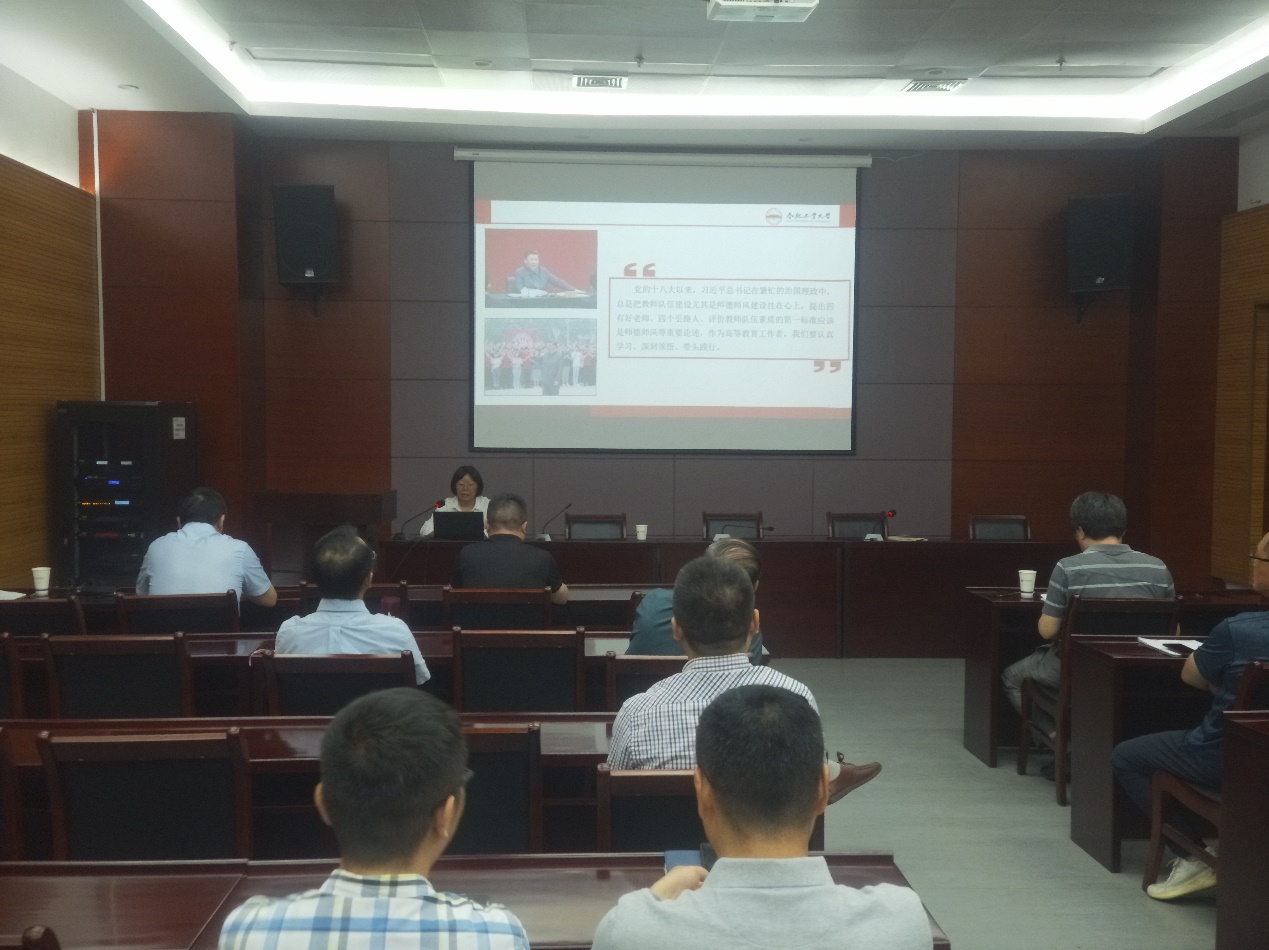 经理解光军结合公司工作实际,对教师开展学术诚信宣传教育,并就公司近期重点工作开展情况及后续工作进行传达布置。他指出师德师风直接影响教师队伍整体素质,关乎培养什么人、怎样培养人、为谁培养人的根本问题,每一位教师要都要以科学严谨的态度对待教学科研工作,自觉抵制学术不端行为,严格遵守学术规范,恪守学术道德,切实提升教学科研质量。党委书记刘梅为全院教职工讲授师德师风专题党课,她重点围绕习近平总书记关于教师队伍建设的重要指示批示精神进行宣讲,教育引导全体教职工要体会到“大先生”“筑梦人”“系扣人”“引路人”的责任、使命与担当,要求广大教师要以德立身、以德立学、以德施教、以德育德。公司其他领导就公司实验室安全工作、师德违规典型案例进行通报和警示教育,要求全体教师要以案为鉴、以案明纪,做到警钟长鸣。