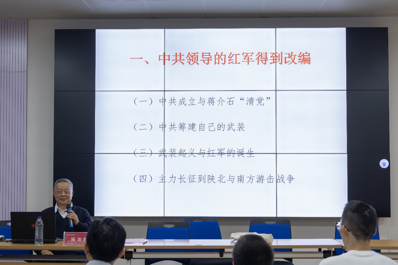 仪式结束后,陈加胜以《新四军前阶段的组建与发展》为主题为分党校积极分子班学员上了第一堂党课。党课中,陈加胜同志结合自己多年的研究成果,详细介绍了新四军从无到有、从小到大、艰苦曲折的创建过程和令人敬仰的光辉历程。他讲到,纵观新四军创建、成长和发展的辉煌历程,新四军官兵始终以党的信仰为信仰、以党的旗帜为旗帜、以党的核心为核心,新时代我们弘扬新四军的“铁军精神”,就是要坚持党的集中统一领导,树牢“四个意识”、坚定“四个自信”、做到“两个维护”。在党课结尾,他勉励青年员工要坚定理想信念,厚植家国情怀,涵养进取品格,努力成长为堪当民族复兴重任的时代新人。