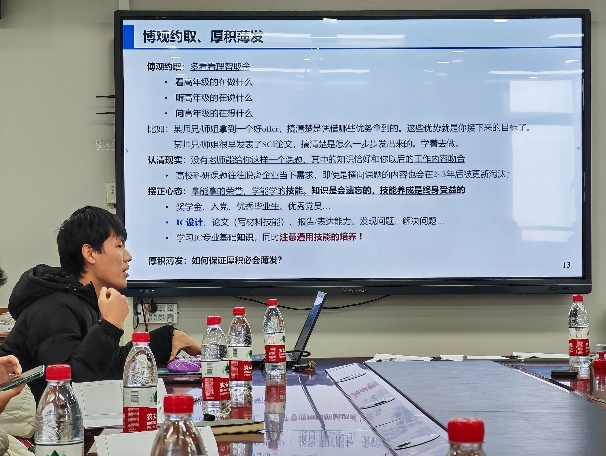 卞景昌首先简单介绍了其个人和团队的基本情况,重点和同学们分享了硕士和博士阶段中面临若干关键节点时的选择及结果,以及自己当初是如何快速融入课题组并顺利开展科研工作的经历。然后,卞景昌详细介绍了在导师黄正峰教授支持下所开展的以物理不可克隆函数为核心的博士课题。最后,以“博观约取,厚积薄发”为主话题和同学们展开互动,就课题组组会、准备小论文、就业和读博等问题进行了深入的讨论。
