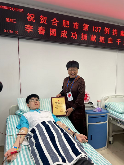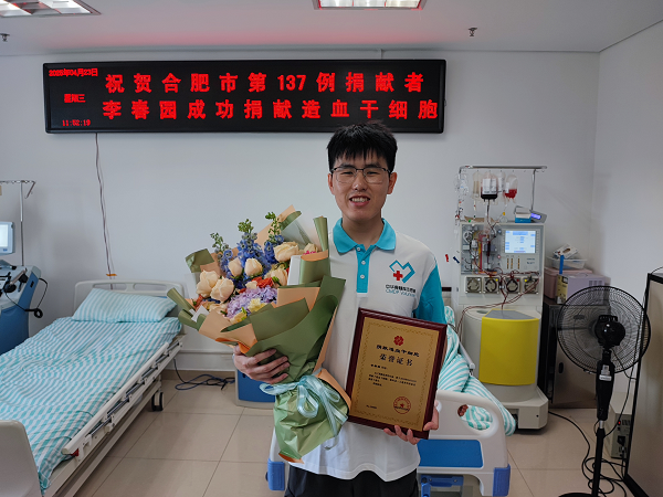 2019年,李春园偶然看到了造血干细胞捐献的宣传折页,便毅然选择留样,加入中国造血干细胞捐献者资料库,成为众多等待为他人带来希望的志愿者之一。今年3月底,他接到合肥市红十字会配型成功的通知,虽然正处在撰写论文的关键时期,但仍没有片刻犹豫,全力配合移植医院确定的时间。经过一系列采集前的检查,4月23日,在安徽省立医院采集室,216毫升造血干细胞混悬液顺利采集,为患者送去生的曙光。李春园成为合肥市第137例造血干细胞捐献志愿者。