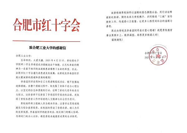 合肥市红十字会在感谢信中写道李春园同学的善举充分彰显了他高尚的品格,诠释了新时代青年的责任与担当,更体现了公司在德育工作中培育的人文精神与社会责任意识;充分肯定了公司在立德树人方面取得的显著成效,以及公司营造的崇德向善、乐于助人的良好校园氛围,并期待未来继续与公司携手,共同推进“三献”宣传教育工作,传递爱心正能量,让更多人感受到社会的温暖与善意。