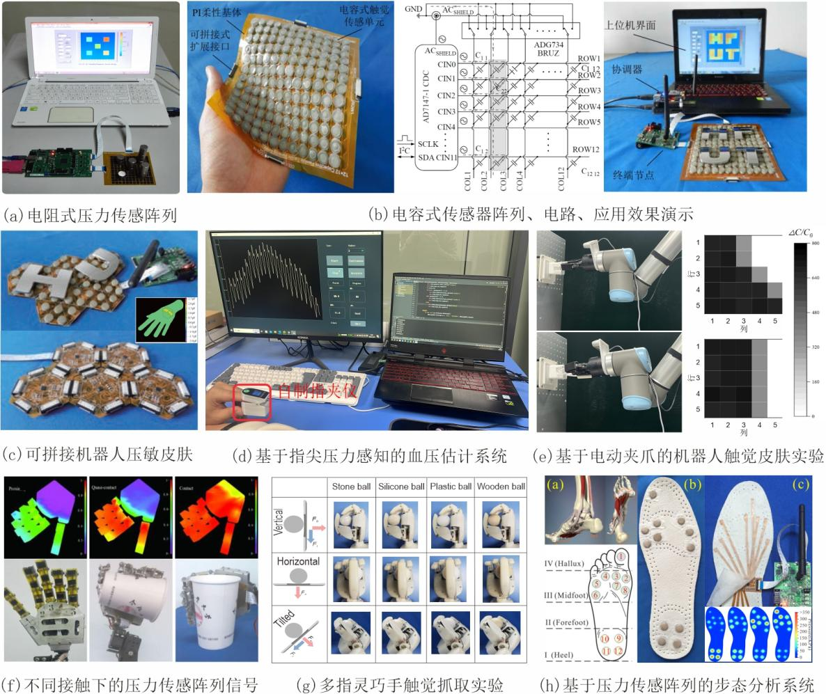 基于石墨烯/炭黑/硅橡胶复合导电材料,研制了12×12小规模电阻式压力传感阵列器件,见图4(a)。提出一种可用于机器人皮肤的全柔性电容式压力传感阵列,并设计成正方形触觉传感阵列和可拼接式阵列结构,见图4(b-c)。设计了基于指尖压力感知的无袖带人体血压动态估计系统,见如图4(d)。制备5×5压力敏感电子皮肤并集成到柔性触觉手指,可用于Robotiq 2F-85夹取插头作业,见图4(e)。设计多个触觉传感器阵列安装于机器人多指灵巧手上,见图4(f)。设计谐振式三维力传感器并安装在机器手上,监测抓取作业过程中的机械手受力状态及被抓取物体的重力变化,识别准确率达92.5%,见图4(g)。将织物压敏单元应用于足底压力信息的时空分布监测,可用于步态分析,见图4(h)。