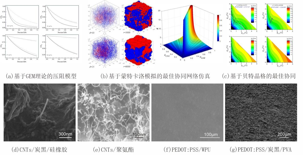 课题组在柔性压力敏感材料体系仿真模拟方面开展了系列工作,构建了弹性力学模型与通用有效介质模型、复合导电高分子的应力-电阻模型和温度-电阻模型,量化了柔性压力传感器的工作原理、灵敏度、非线性等静态特性指标与填料体积分数的关系,揭示了碳填料结构参数与复合导电材料体系宏观导电特性的内在关联机制,系统研究了复合导电高分子中几何协同效应、电学协同效应、压阻效应,首次提出电学协同效应中的电学增强型效应可以与较高的应变灵敏度系数共存。如图1(a-c)所示。还制备了基于碳材料的多种柔性复合压敏导电材料,系统探究了碳填料组合选取与优化、填料-基体界面结合、制备方法与复合工艺等关键技术,如图1(d-e)所示。近期,又发展了基于PEDOT:PSS的柔性复合导电材料制备方法,探索加入表面活性剂、盐、两性离子和酸性溶剂对PEDOT:PSS电导率的改性机理,成功制备得到水性聚氨酯改性PEDOT:PSS薄膜以及聚乙烯醇改性PEDOT:PSS薄膜,相关研究结果见图1(f-g)。