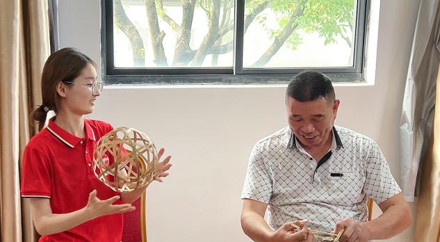 实践团队第二站来到西安社区党群服务中心,采访了非遗传承人陈师傅,并近距离学习滚灯制作技艺。陈师傅因热爱与滚灯结缘,加入滚灯队后深耕制作技艺。在他的指导下,队员们开始尝试编织滚灯,看似简单的动作,是历经无数次的重复打磨。亲身体验后,队员们深刻体会到,一件滚灯从竹料到成品,处处凝聚着匠人的耐心与坚守。
