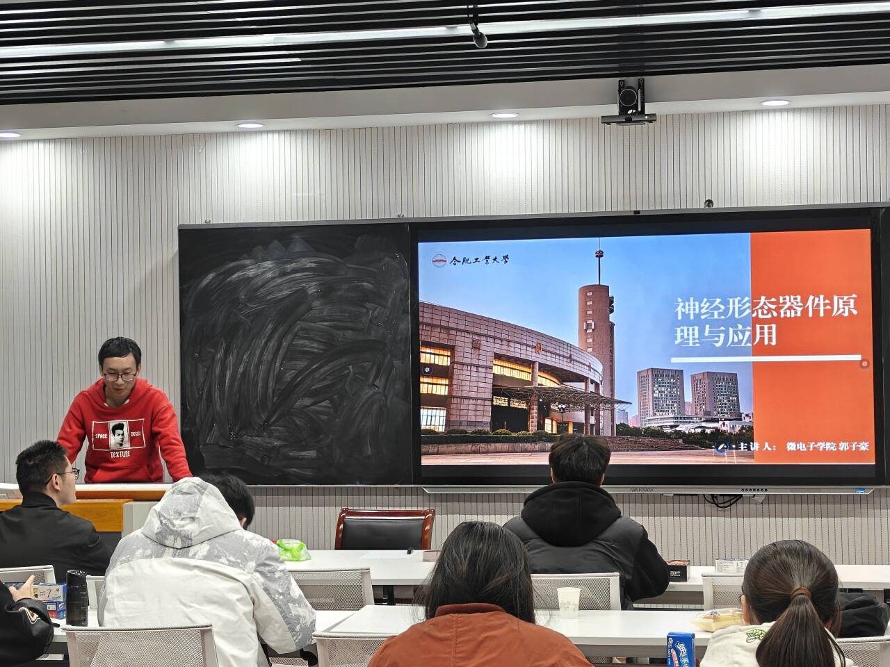 本次交流会设置了学术分享与互动研讨两大环节。在学术分享环节,三位主讲人结合自身研究领域进行分享,郭子豪同学聚焦神经形态器件研究,系统阐述其工作原理与应用前景;王义超同学以硒硫化锑光伏材料为切入点,从带隙调控与界面工程角度分享提升光电转换效率的创新路径;张新福同学则以全国集创赛获奖项目为例,深入解析多精度张量计算单元的设计验证流程及SAR处理器定点化优化策略。在互动环节中,与会同学围绕报告内容展开热烈讨论,既有对技术细节的专业追问,也有跨学科思维的碰撞交融。