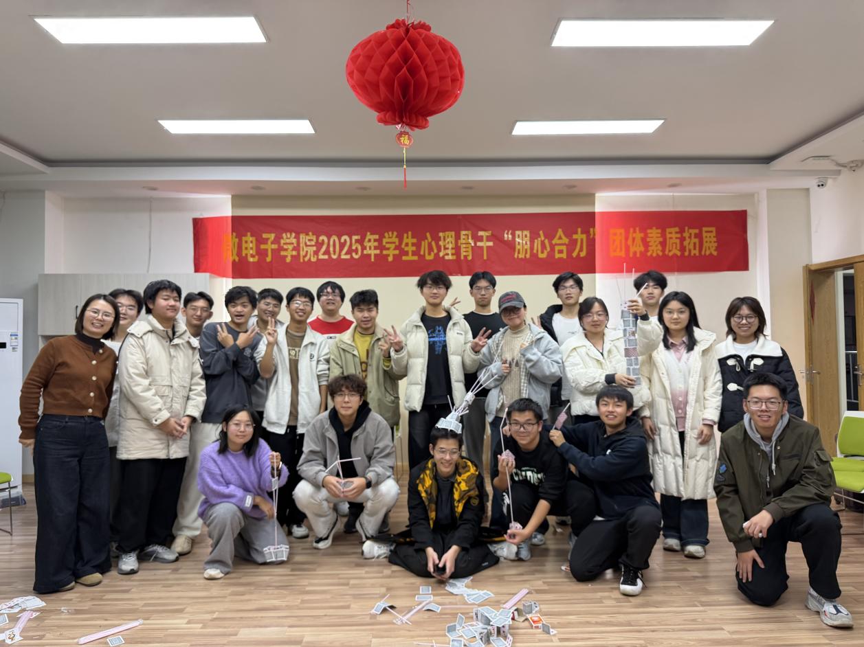 “朋心合力”团体素质拓展以“心火燎原,光耀芯河”为题,由“找零钱”,“填补bingo单”“搭建扑克塔”“我们是最棒的”四个部分组成。作为开场热身活动,“找零钱”考验了参与人员相互配合的默契及反应能力,并成功调动现场氛围,激起参与学员的热情。“填补bingo单”则让每个人在寻找他人特点的过程中相互了解,促进破冰,同时锻炼参与者社交的主动性和积极性。“搭建扑克塔”环节则展现出团队协作能力与良性竞争意识。参与者人通过切身体验,在轻松愉快的氛围中,完成自我素质的相关拓展。“我们是最棒的”让同学们找回自信、学会寻找集体的力量。