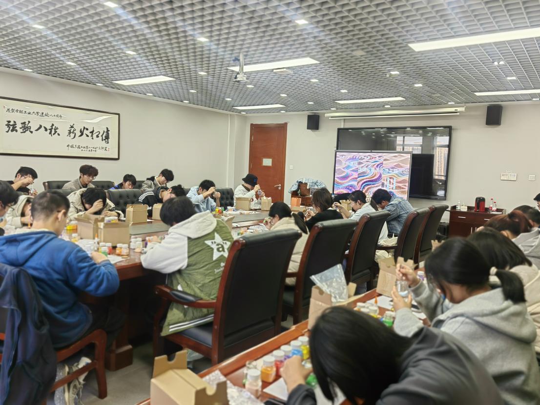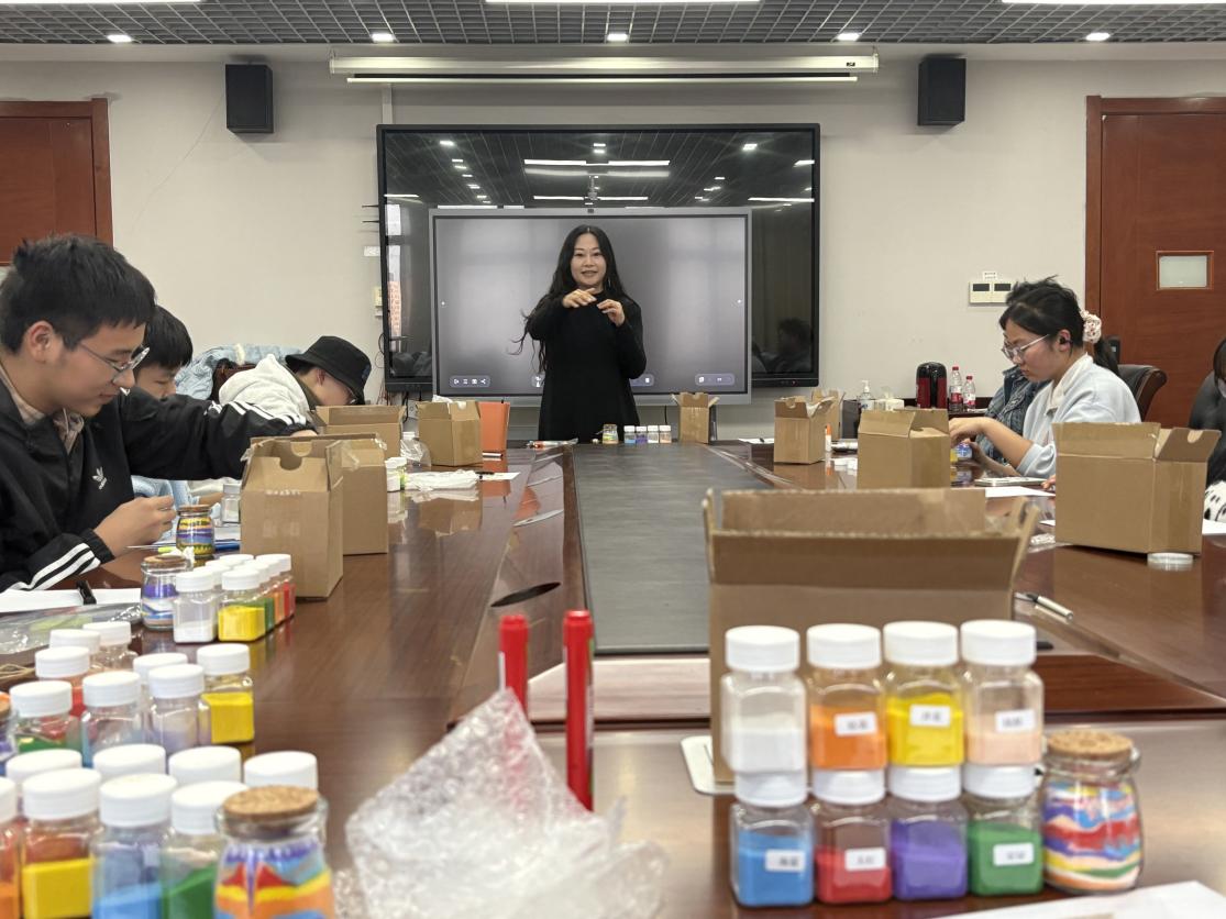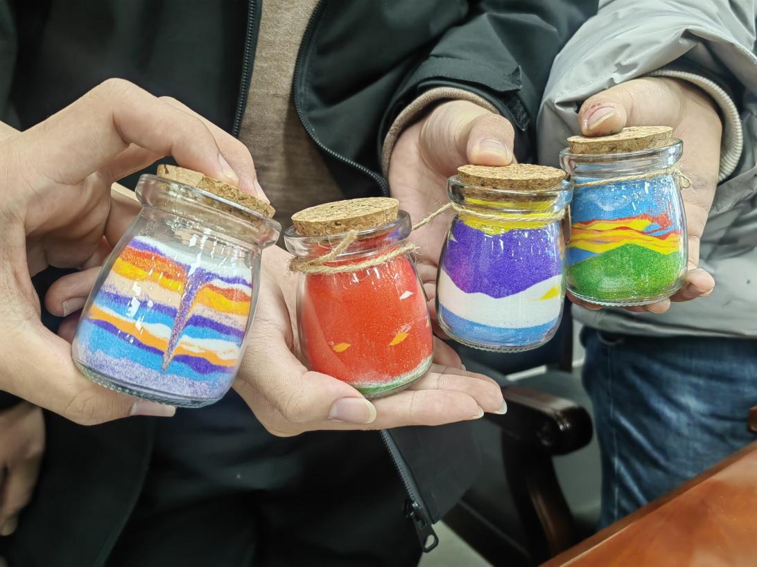 本期沙龙是一次轻松的手工体验,是一次情绪层次的深层觉察,贾老师为同学们讲解了情绪管理的大脑神经机制,在老师的指导下,同学们借助情绪/压力沙瓶画,通过艺术创作来疏导情绪、缓解压力。同学们通过在瓶中分层注入彩砂,将抽象的情绪转化为具象的艺术作品,从而达到释放压力、专注内心体验的效果。