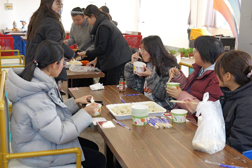 随后,同学们三到五人为一组,食堂工作人员给每组分发饺子皮和馅料,由同学们自行包饺子。虽然很多同学都是初次尝试包饺子,手法略显生疏,但每个人都乐在其中,不时传来欢声笑语。不少同学还发挥创意,尝试包出不同形状和图案的饺子,让这场活动更添了趣味性。大家在包饺子的过程中,不仅学习到了包饺子的技巧,还交流了各自的家乡习俗和冬至的庆祝方式,增进了彼此之间的了解和友谊。经过一个多小时的努力,随着一盘盘热气腾腾的饺子端上桌,同学们围坐一起,饺子的香味和同学们的欢声笑语交织在一起,共同品尝自己的劳动成果,幸福感满满。