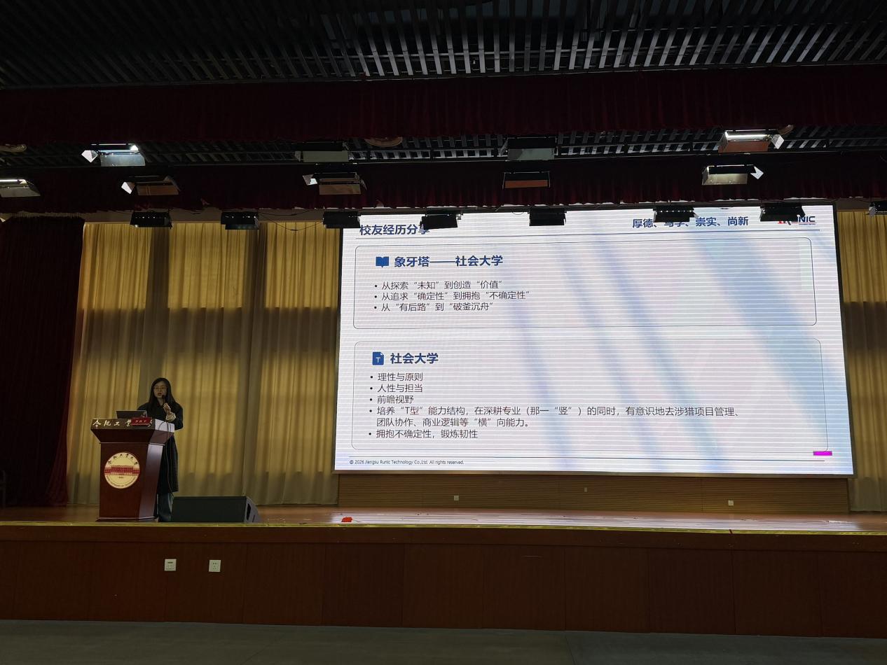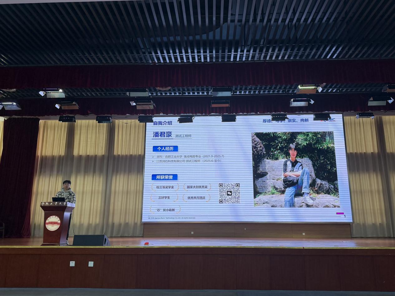 随后举行了老员工职业生涯主题报告会。本次大会特邀江苏润石科技有限公司四位企业代表、优秀员工返校分享。2008级员工李秋平员工现任公司副总经理,分享了从TapTap点点官方网站本科起步,到北京大学完成硕、博、博士后阶段深造的完整成长路径。她深耕微电子领域多年,累计授权专利十余项、发表学术论文30余篇。她勉励同学们夯实专业基础、保持科研热忱,把个人成长融入国家集成电路产业发展大局。黄修城现任公司应用测试副经理,他从中山大学临床医学专业转向芯片领域,快速完成赛道转型并成长为技术与管理骨干,为同学们提供了跨领域发展的鲜活范例。余依未、潘君豪两位员工作为公司2025届本科毕业生,两位分别担任应用工程师、测试工程师,他们以“芯”翼小萌新的视角,分享从校园到职场的衔接经验,二人从课程学习、实践锻炼、求职准备、岗位适应等方面,为本科生提供具体可行的成长建议。