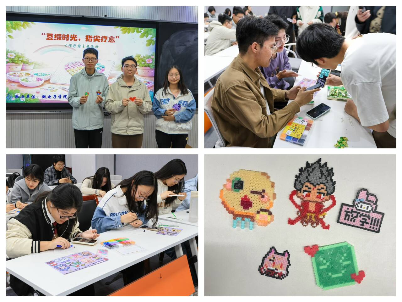 本次活动打破传统心理健康教育讲座模式,以“拼豆”这一轻松有趣、易于参与的手工形式为载体,引导同学们在动手实践中释放负面情绪、舒缓学业压力。活动现场,同学们全神贯注地挑选豆粒、拼接图案,在指尖的灵动操作中沉淀心绪、专注当下,一个个独特精致的拼豆作品逐渐成型,成为大家情绪表达的具象载体。活动特别设置“心声分享”环节,同学们逐一展示自己的拼豆作品,分享创作过程中的思路、心境以及完成作品后的成就感与感悟,每一件作品背后都藏着一段独特的青春故事,每一次分享都传递着温暖与力量。活动尾声,同学们将亲手制作的拼豆作品加工成钥匙扣、挂件等纪念物,珍藏这段“指尖疗愈”的美好时光,让心理减压的温暖与收获伴随日常学习生活。